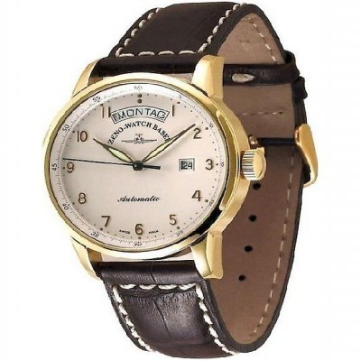 Marque : Zeno Watch Basel Groupe de produits : Montres Groupe cible : Hommes Couleur du boîtier : or jaune Verre : verre saphir Matériau du bracelet : cuir ? Mm : 42 Matériau du boîtier : acier inoxydable Couleur du cadran : blanc ? Autre : arrière de l'écran Autre : Swiss Made Affichage : analogique Couleur du bracelet : marron Surface du revêtement : poli Forme du boîtier : rond Type de montre : montres automatiques Type de mouvement : automatique Type de fermeture : boucle ardillon