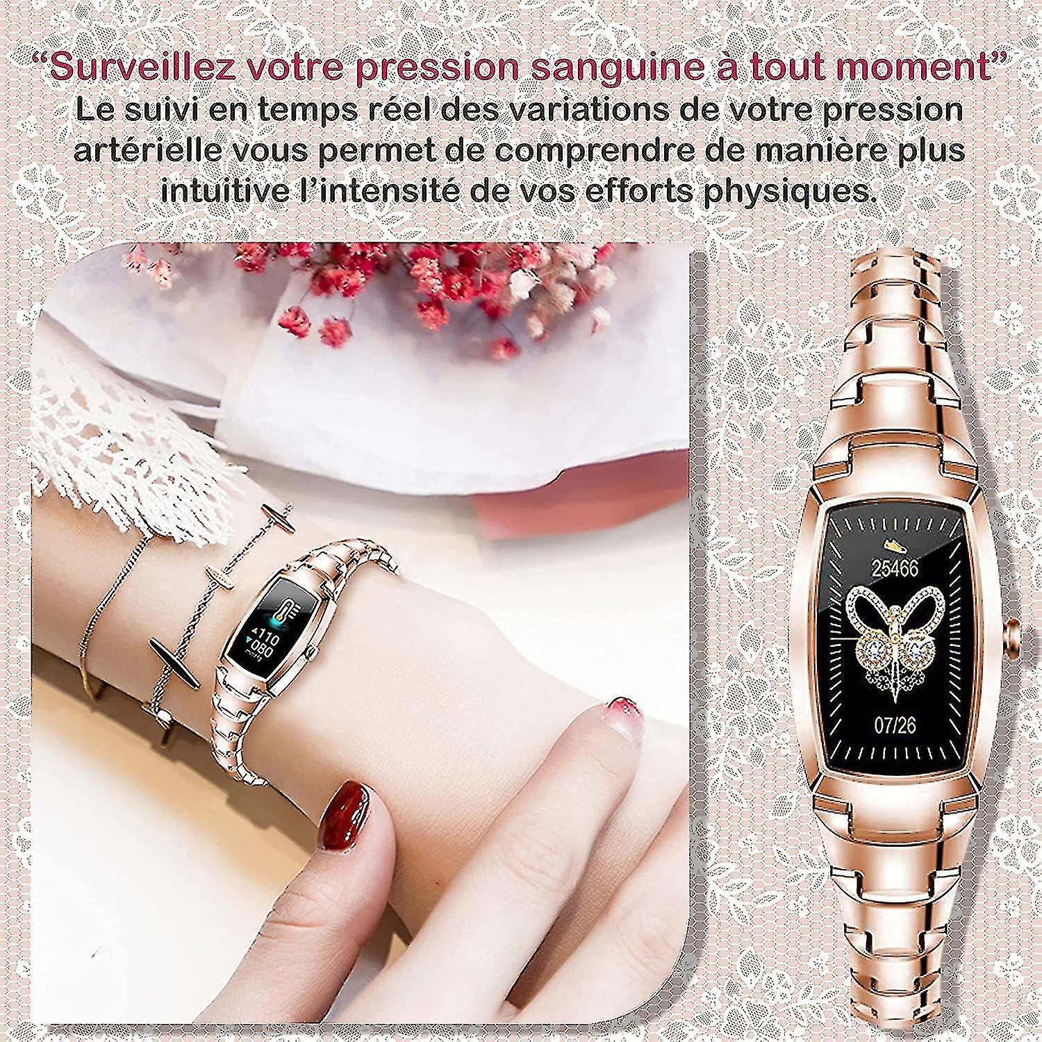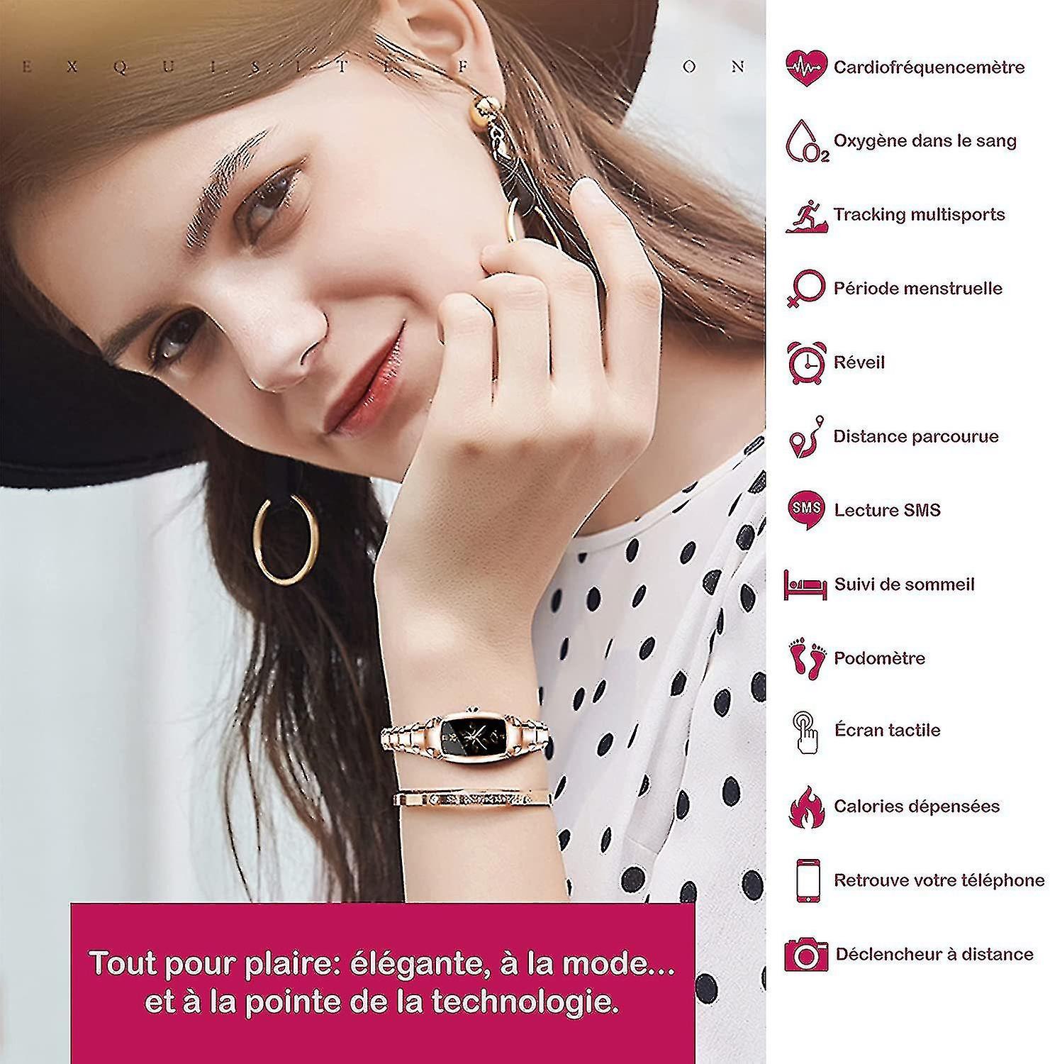 Montre connectée et tracker de santé La montre connectée vous permet d'enregistrer avec précision toutes les activités de la journée comme le nombre de pas, la distance parcourue, les calories brûlées, la fréquence cardiaque, l'état du sommeil et bien plus encore. Cette montre connectée prend en charge plusieurs modes sportifs. De quoi rester motivé toute la journée Cette montre connectée est un très bon choix de cadeau. Notifications d'appels et de messages Ces montres connectées (or rose ou argent) vibreront lorsque vous recevrez des appels ou des messages entrants (Facebook, Twitter, WhatsApp, Line, SKype, Twitter, Wechat, etc.). Vous pouvez voir le contenu du message directement sur la montre. Si vous êtes occupé, vous pouvez raccrocher directement les appels. Les montres pour femmes élégantes, étanches et de haute technologie IP67 ont les fonctionnalités les plus intelligentes du marché, comme les prévisions météorologiques synchronisées, les rappels de sédentarité, le réveil vibrant, la musique complète et le contrôle de l'appareil photo. Votre téléphone via l'écran de la montre, chronomètre, réglage de la luminosité (levez votre poignet pour éclairer l'écran), charge rapide magnétique, etc. Plus qu'une simple montre pour femme Cette montre connectée utilise un écran tactile IPS HD de 1,09 pouces (2,54 cm) et est fabriquée en acier inoxydable pour vous apporter une meilleure expérience : tout pour avoir un look élégant. La tension artérielle, le taux d'oxygène dans le sang et le cycle menstruel font également partie des applications de cette montre : vous avez un suivi complet. Batterie longue durée et large compatibilité La montre Bluetooth pour femme est compatible avec Android 4.4 ou IOS 8.0 et supérieur (Bluetooth 4.0 ou supérieur requis), convient uniquement pour la connexion smartphone, pas pour PC, iPad, tablette. Scannez le code QR ou téléchargez/installez l'application "F Fit" depuis votre boutique d'applications mobiles. Ouvrez-la et activez le Bluetooth. Cliquez sur "Ajouter un appareil" et sélectionnez la montre. Profitez