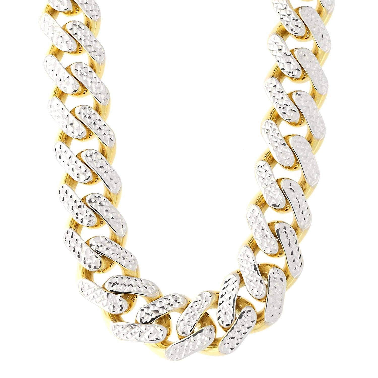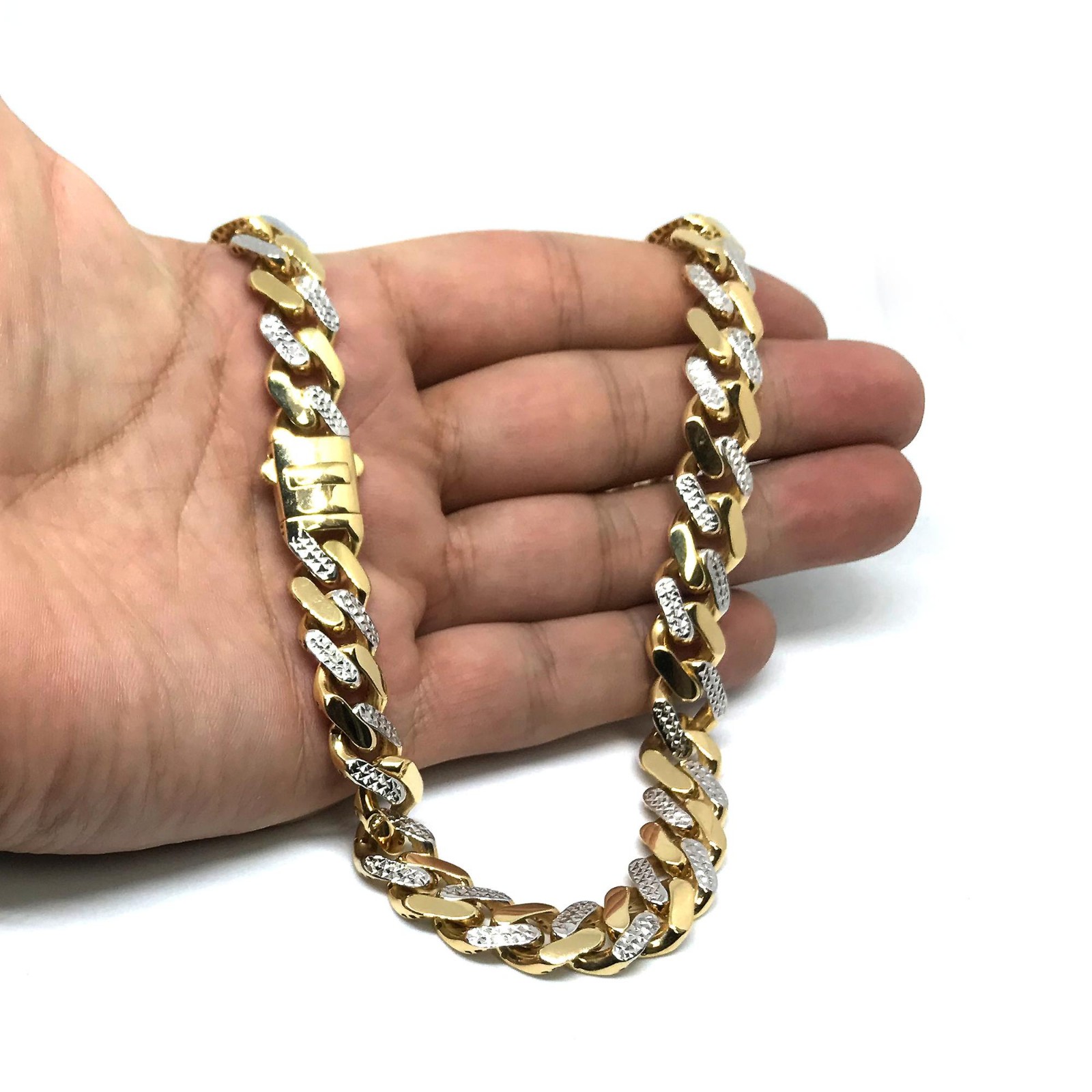 Cette chaîne à maillons cubains Miami en or jaune et blanc 14 carats offre un look de collier moderne. D'une épaisseur de 11,3 mm, cette chaîne est disponible en longueur de 24 pouces. Parfait pour les pendentifs et peut également être porté seul. Comprend une boîte avec fermoir à pression des deux côtés pour maintenir la résistance et le confort et peut être porté aussi bien par les femmes que par les hommes. Le poids du collier est de 41,3 grammes et est estampillé du poinçon d'authentification en métal 14 carats. - Cette chaîne est fabriquée en véritable or massif jaune et blanc 14 carats et est estampillée du poinçon en métal 14 carats approprié - Collier de style chaîne à maillons cubains Miami idéal pour le porter seul ou avec des pendentifs - La largeur du collier est de 11,3 mm - Le collier a un fermoir à boîte et a une finition hautement polie qui lui donne un aspect brillant - Poids du collier en grammes : 41,3 gr